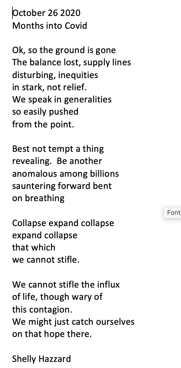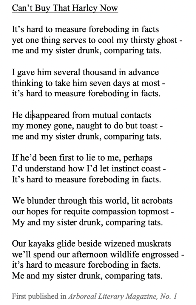 Charlotte had a villanelle published in the inaugural issue of Arboreal! If you’ve never been ripped off by a contractor, you can let this piece be your warning. Check out “Can’t Buy That Harley Now” on page 43. Also, view our friend Delight Roger’s art on page 81.
